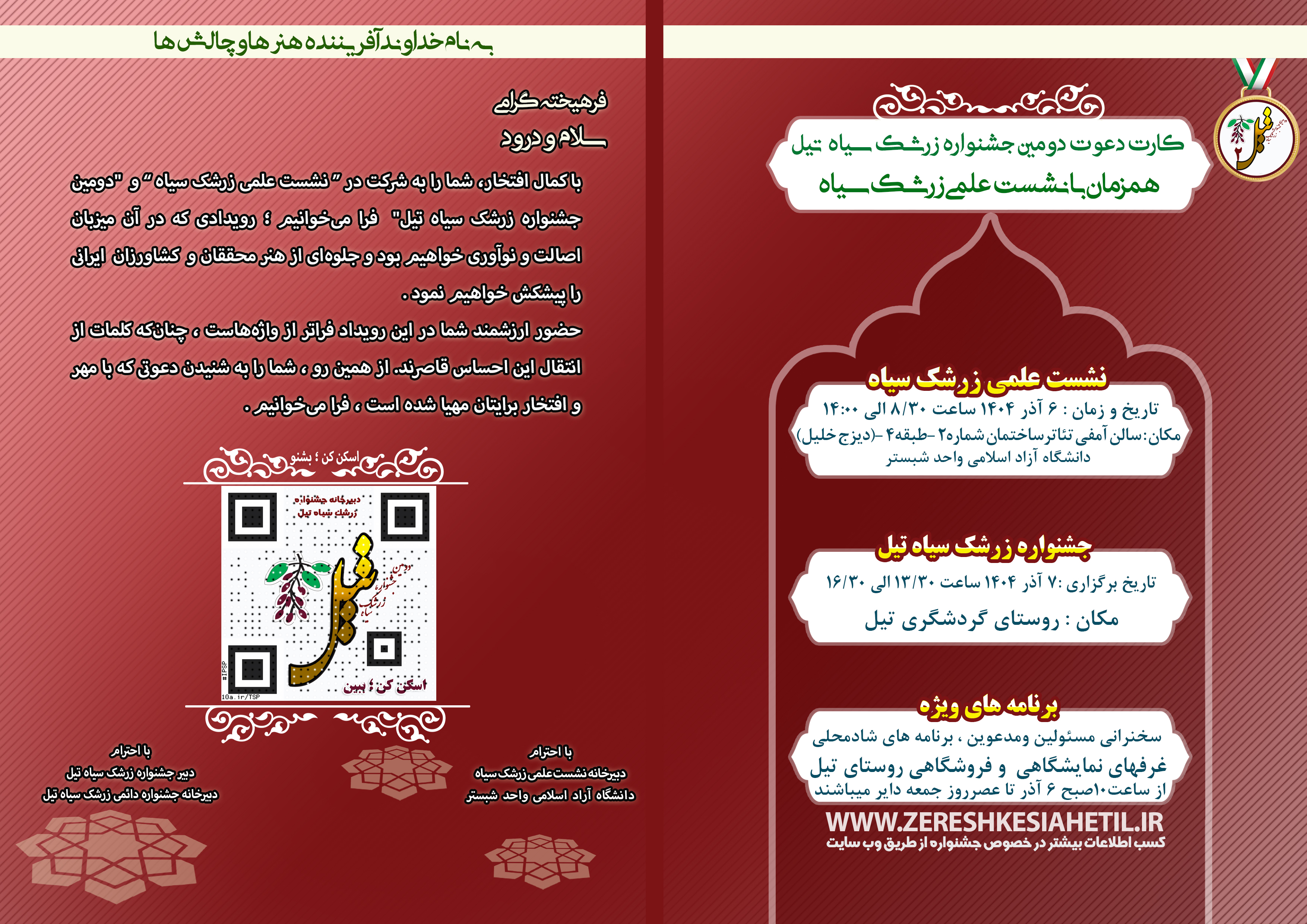 دومین جشنواره زرشک سیاه تیل در تاریخ 6و7 ادر ماه 1404 در روستای گردشگری تیل برگزار میگردد .